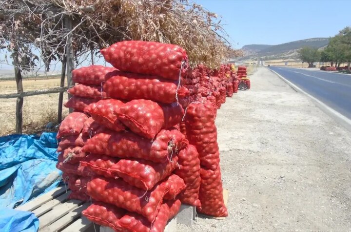 Gaziantep'in Nurdağı ilçesindeki 61 yaşındaki çiftçi Harun İbili, hasat ettiği 'Keferdiz soğanı'nı yol kenarında...