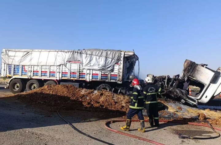 Gaziantep-Nizip otoyolunda park halindeki bir tıra çarpan tır alev topuna döndü. Kazada tır şoförü...